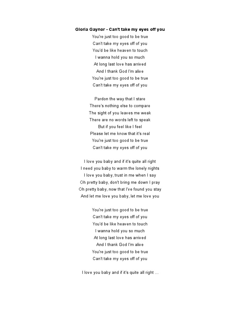 Cant take my eyes off of you. Gloria Gaynor - Cant Take My Eyes Off You Letras y canción para escuchar - Youre just too good to be true Cant take my eyes off of you I love you baby And if its quite all right I need you baby To warm the lonely nights I love you baby Trust in me when I say.